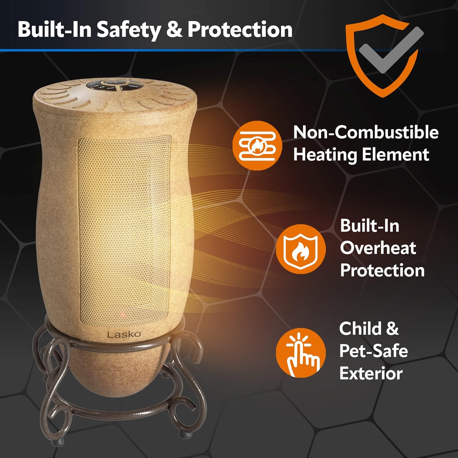 - â ăBUILT-IN SAFETY FEATURESăOverheat protection ensures the space heater does not overheat even if left on for an extended amount of time. While a cool touch exterior keeps the heater cool to the touch even after running for hours