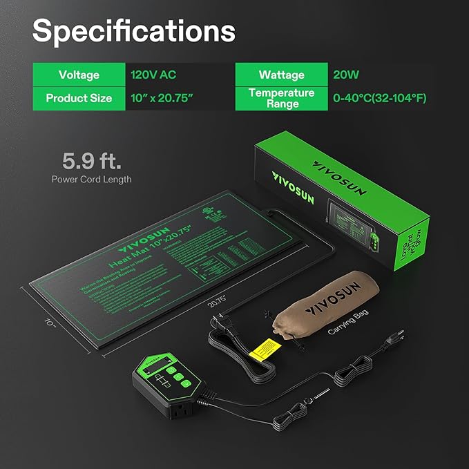 - Reliable Results: The VIVOSUN professional heat mat maintains optimal temperatures around 68-86℉ (20-30℃), perfect for Seedling start and cutting propagation; Made from durable PVC material, it's designed to last