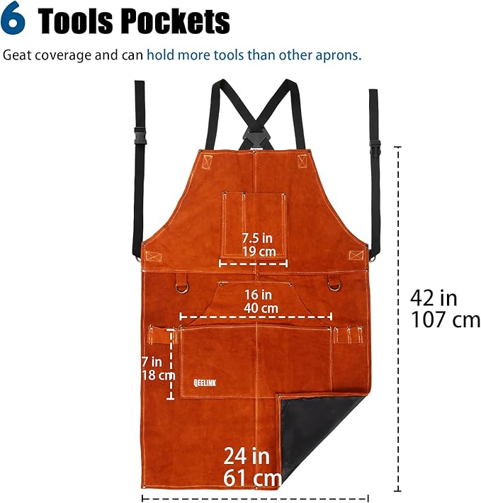QeeLink Leather Welding Apron with 6 Pockets - Heat & Flame-Resistant Apron, 24'' X 42'', Adjustable M to XXXL