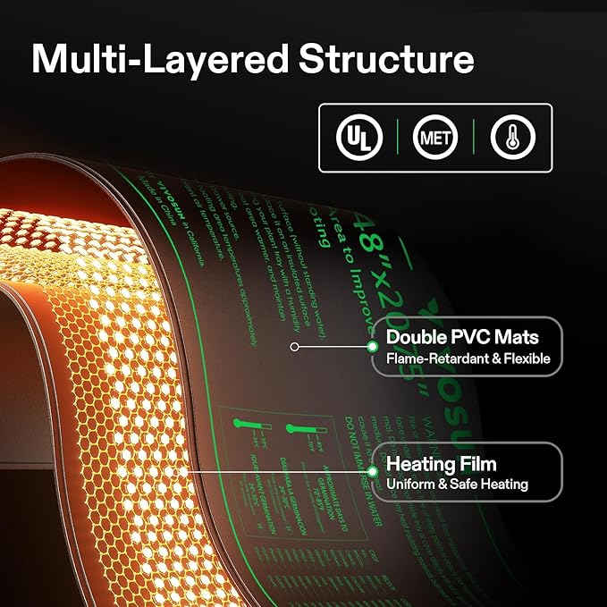 - Reliable Results: The VIVOSUN professional heat mat maintains optimal temperatures around 68-86℉ (20-30℃), perfect for Seedling start and cutting propagation; Made from durable PVC material, it's designed to last