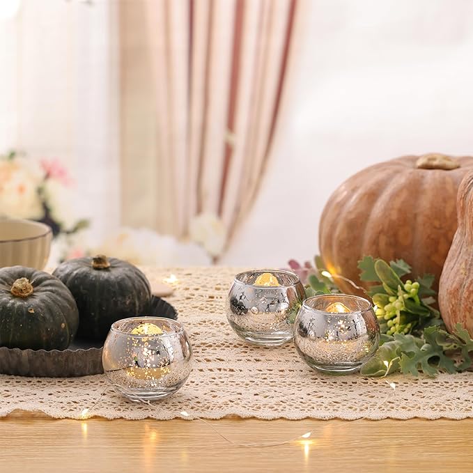 - SILVER CANDLE HOLDER--Antiqued Metallic Finish: Mercury speckled effect on the tealight holder will enhance the natural warm light of candles, giving it a vintage but timeless look. Use these pretty silver mercury glass votives as part of your overall decor, or as a favour for your guests.