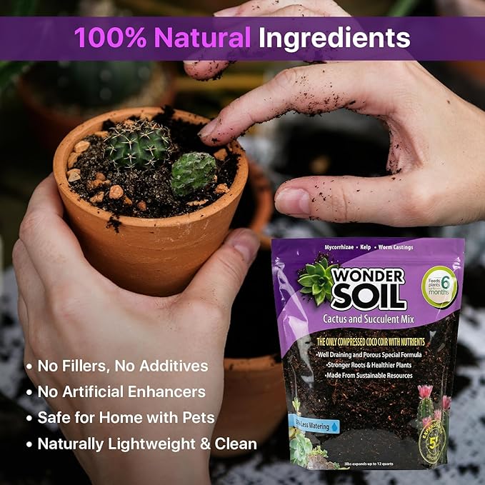 WONDER SOIL | Organic Cactus & Succulent Soil Mix (12 Quarts) | Fast Draining Living Coco Coir Loaded w/Nutrients | Ready to Plant Indoor/Outdoor Peat-Free Potting Soil | 3 LB Expands to 12 Quarts