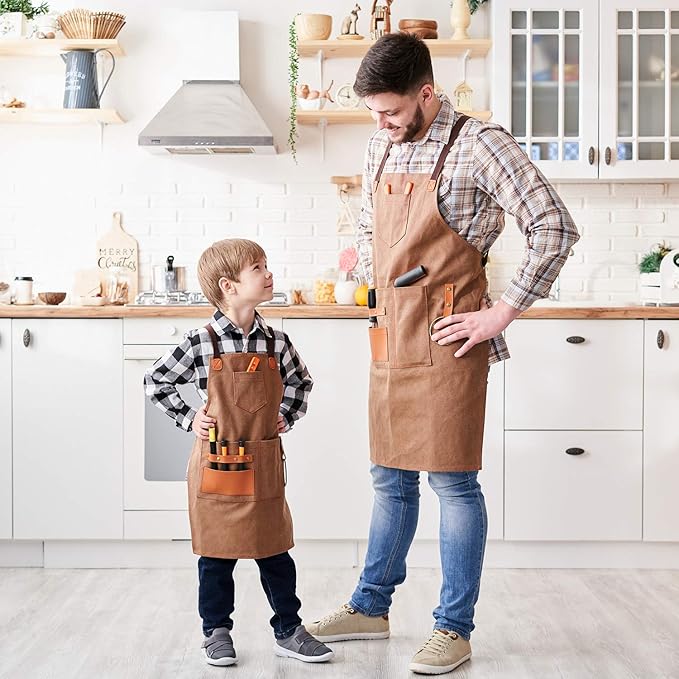 - MUILT-PURPOSE USE STYLISH APRON: NEOVIVA PRO kids woodworking apron for kid boys gives an idea to set up the father and son aprons matching set. Every boy wants to act and help father during daily activities. Little boy will love this canvas apron to follow his father.