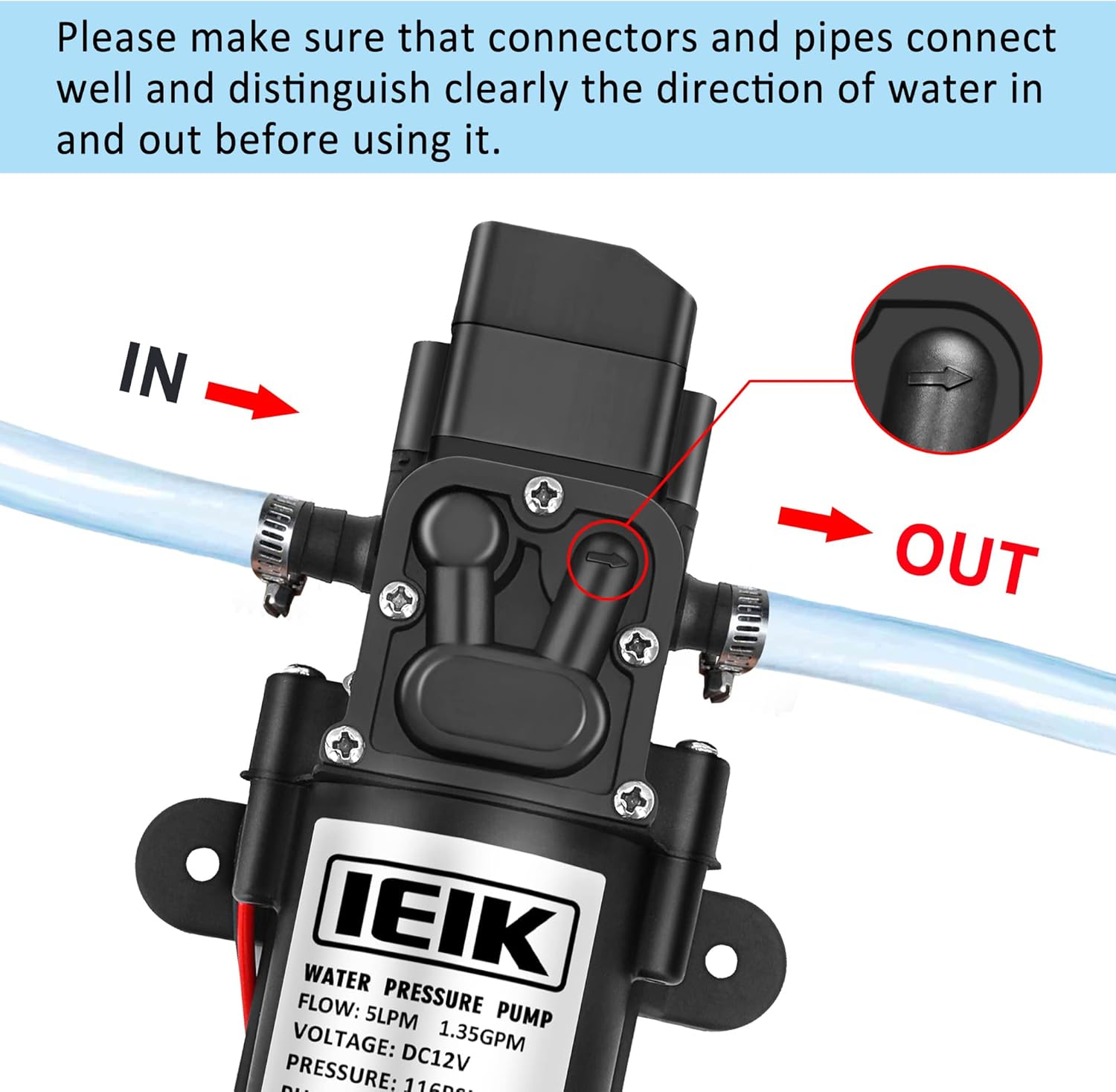 - Features: The IEIK diaphragm pump is equipped with a power of 60W, a pressure of 116Psi, and a water flow rate of 5L/PM and 1.35GPM. If you are concerned about low water pressure or flow rate, I think this is a good choice because the strong pressure leads to loud noise. Worried about excessive noise, please choose a low-power model.