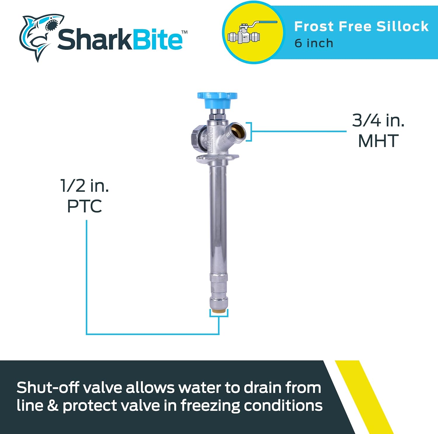 - SHARKBITE FROST FREE SILLCOCK: Outside faucet valve features an integrated 1/2 inch push-fit inlet and 3/4 inch garden hose outlet; a shut-off can be found at the inlet of the sillcock to drain the water and provide protection for the valve when freezing