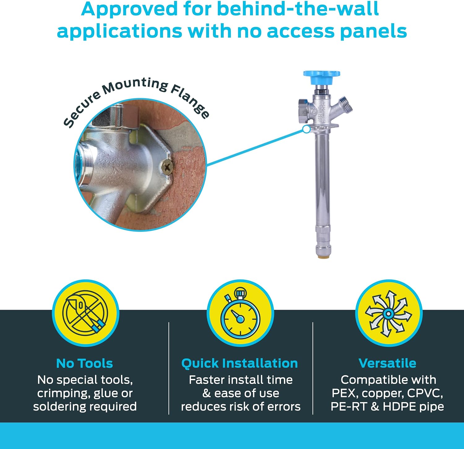 - VERSATILE: Push-to-connect sillcocks work well with PEX, CPVC, PE-RT, SDR-9 HDPE, and copper pipes; ideal for working in tight spaces
