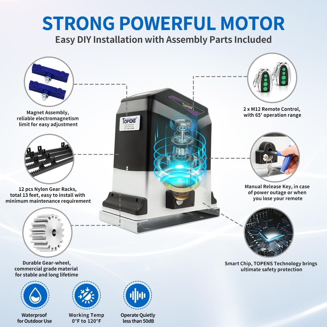 - 【Choose TOPENS】 Over 25 years of specialized experience in gate automation industry. We aim to deliver safe, smart & reliable gate operator systems with long-lasting performance. Equipped with a STRONG 3/4 HP 550W AC motor, RK1200T sliding gate opener smoothly drives the heavy-duty slide gate up to max 3400lbs. in weight and max 40ft. in length. This ultra-quiet electric gate motor will automatically open and close your gate, and bring your family an easier and more comfortable life.