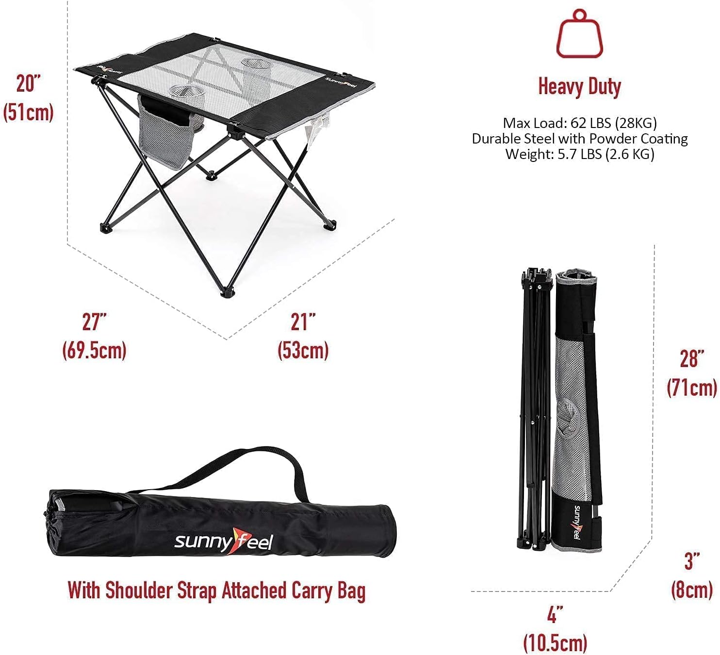 - Built to Last: The Steel with powder coating has great strength, durability, This camping table affords up to 62 LBS (28KG) weight capacity, and the top is 100% waterproof for effortless clean-up. You don't have to worry for the heavy-duty use, either to buy a new one in the near future.