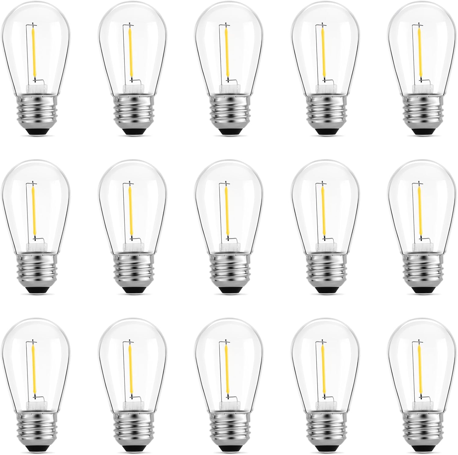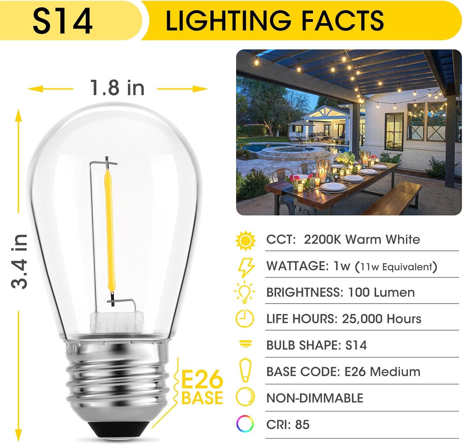Meconard Outdoor Patio String Light Bulbs, Shatterproof Waterproof S14 LED Replacement Bulbs for Outdoor String Lights, 1W LED Bulbs Equal to 11W Incandescent, 2200K Warm White, E26 Base, Non-Dimmable