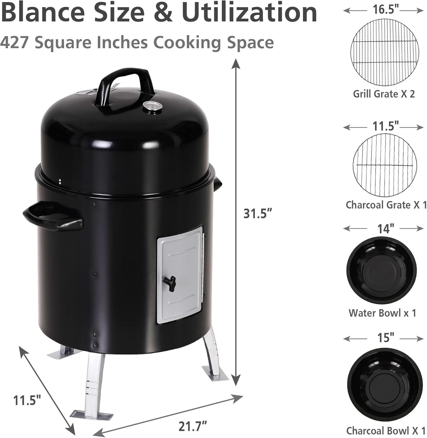 Sophia & William 17" Vertical Charcoal Smoker Grills with Two-Tier Grates, Heavy-Duty Integral Chamber and Tunnel Ventilation System for BBQ, Patio, Outdoor Camping(Black)