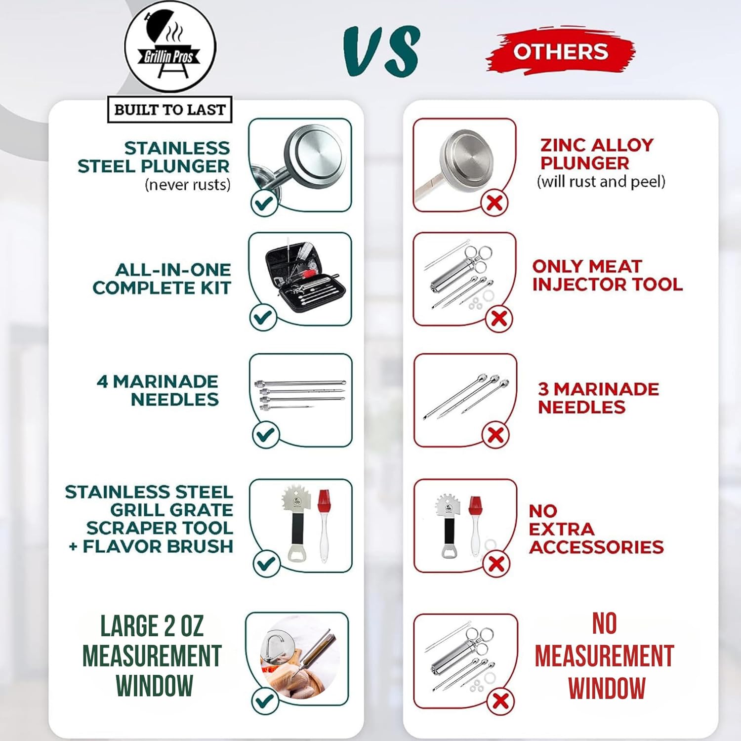 - UNBREAKABLE STAINLESS STEEL - Our meat injectors for smoking and grilling are unlike any tool on the market. We’ve built our products with the highest grade 304-stainless steel, corrosion-resistant, and easy to clean. Deliver flavor deep beyond the upper surface; Say goodbye to dry, boring cuts and take your bbq, turkey and brisket injection game to the next level; For people who care about mouthwatering meat, Grillin Pros meat injector syringe kit is the obvious solution.