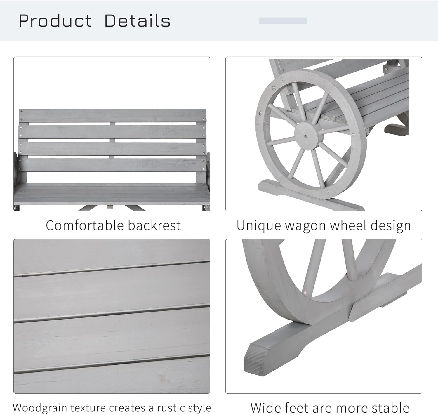 Outsunny 41" Wooden Wagon Wheel Bench, Rustic Outdoor Patio Weather Resistance Furniture, 2-Person Slatted Seat Bench with Backrest, Light Gray