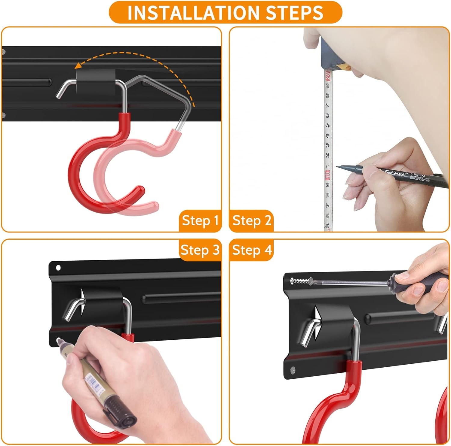 - QUICK & EASY INSTALLATION: Installation is a breeze, it comes with the screws and anchors needed to put it basically anywhere in the garage where you have room. The mounting holes are 16" apart! Perfect for studs. If your studs are not 16", it will be better to put additional 2x4 wood to mount the garage wall hooks. You just slip the handle on and it immediately locks in, extremely easy to use.
