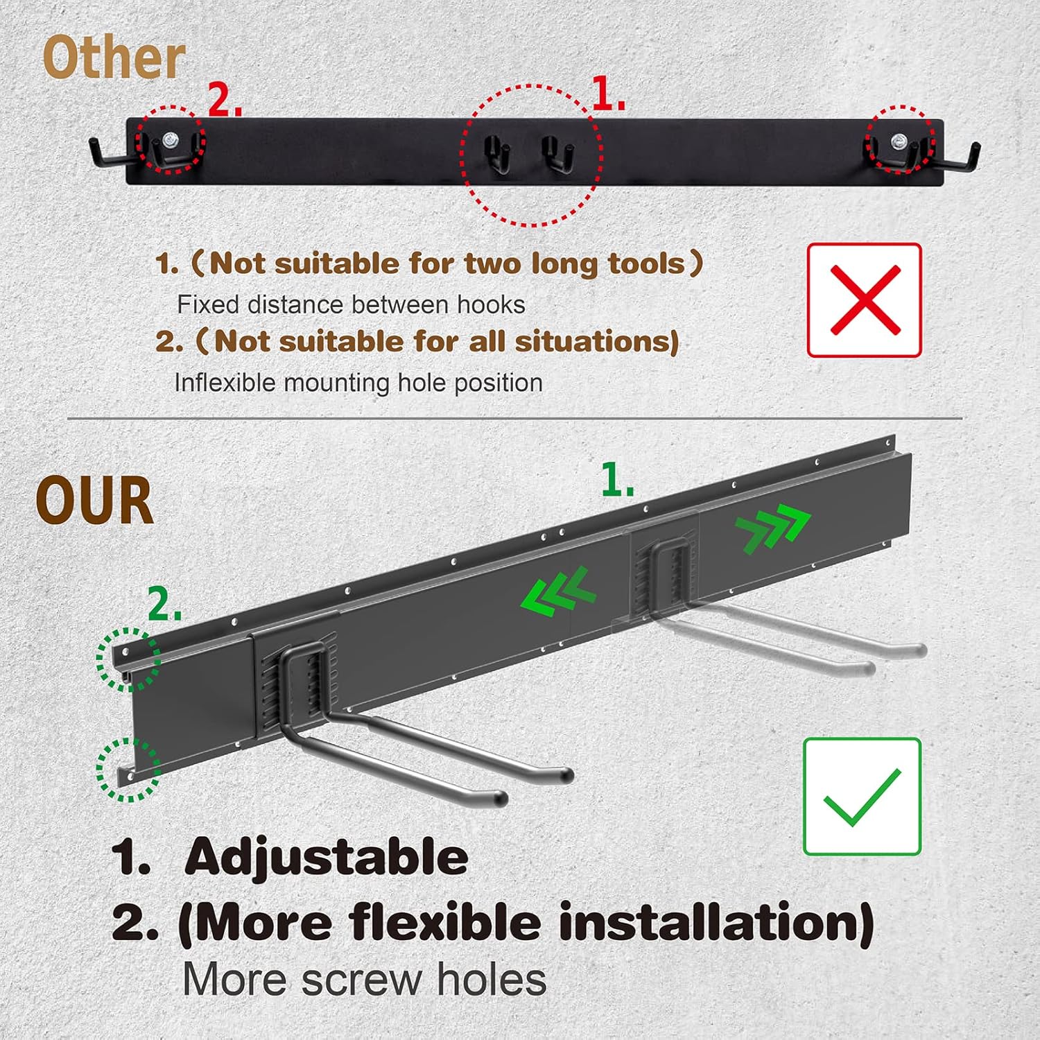 - 【Adjustable Design】We designed the garage hooks to be adjustable in rails, each hook has 12 solder joints and a rubber pad on the bottom to hold them securely on the board.