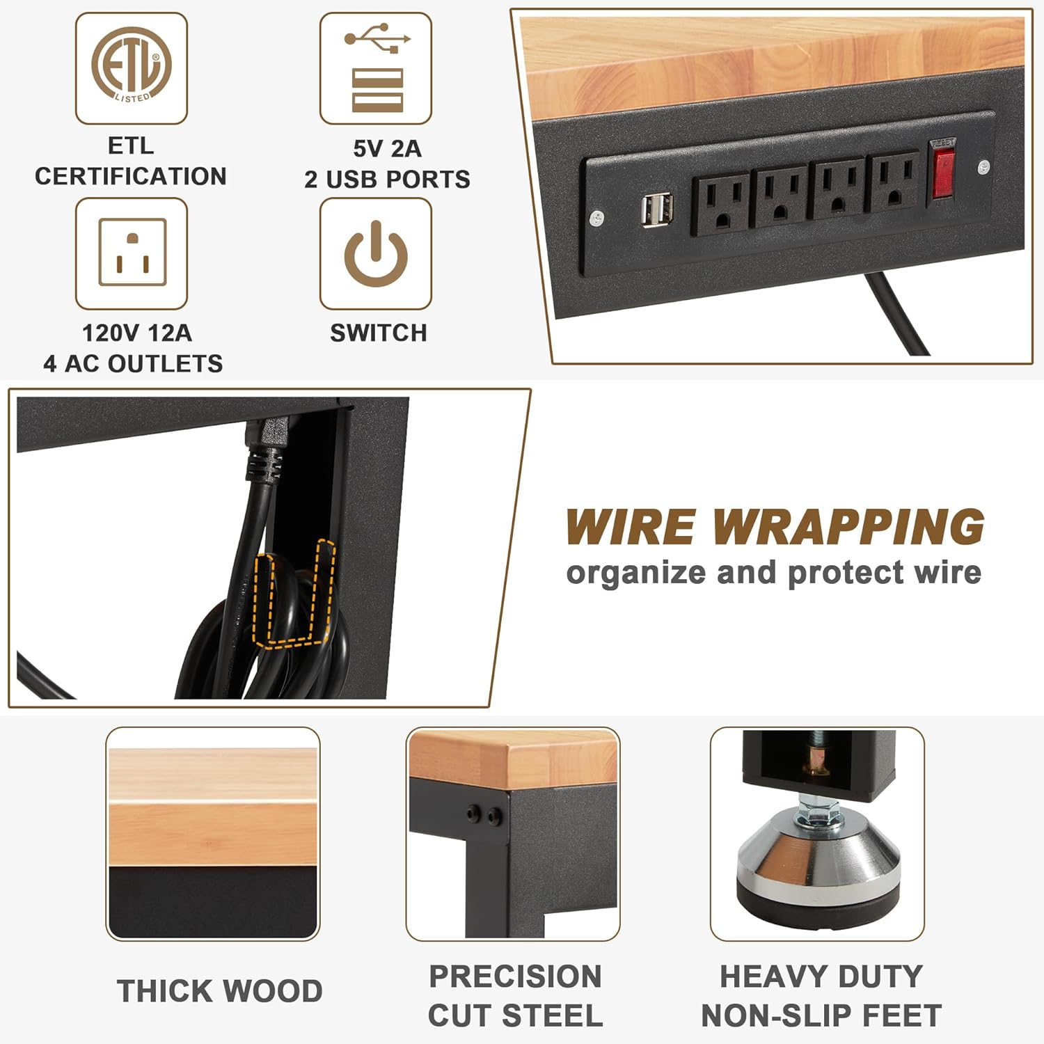 - Etl Certification Power Outlets: Convenient to use various of electric tools and lamps; Totally 4 AC Outlets, 2 USB Ports and 1 Switch on the power strip which is ETL certified for safety and durability