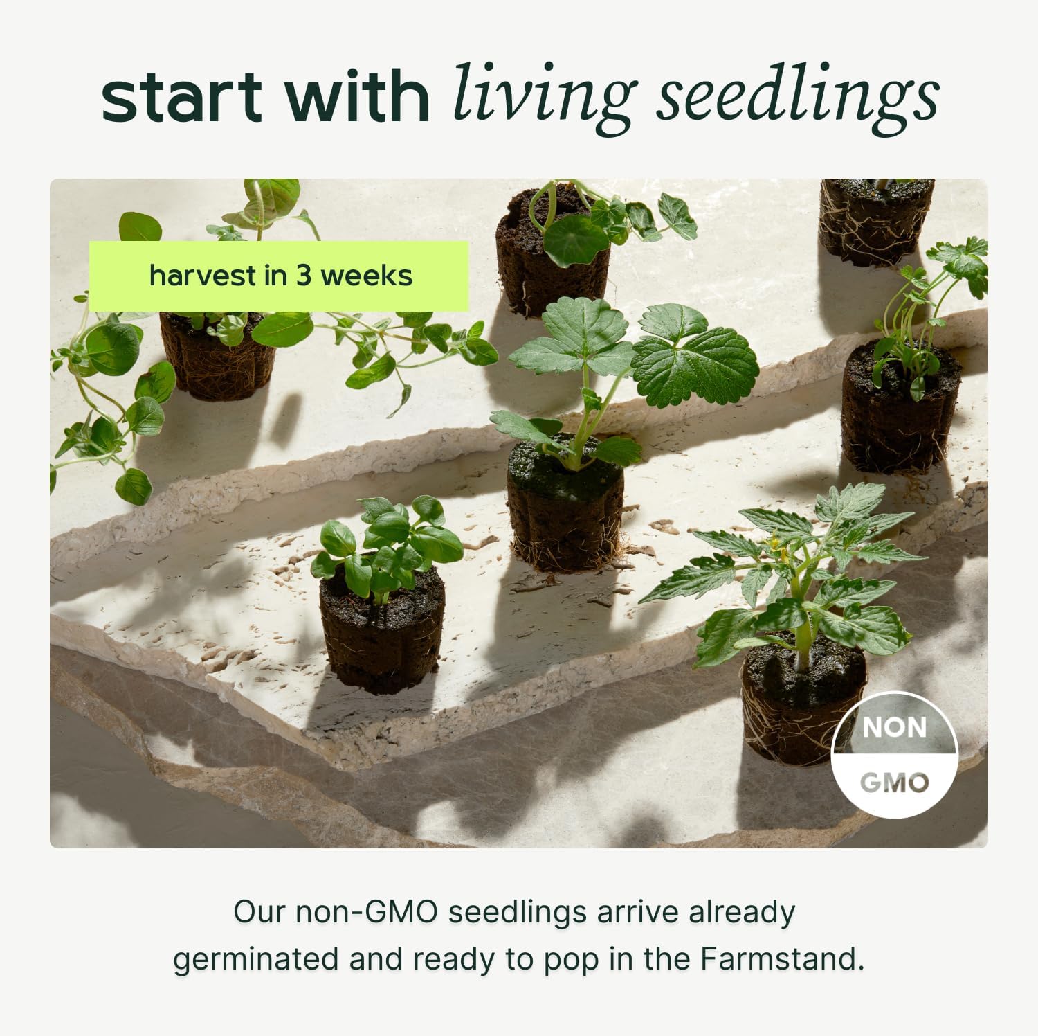 - 18 SEEDLING CREDITS: This starter kit includes a unique QR code on your packing slip with instructions to redeem 18 seedlings from our website. Your special seedling bundle includes the best veggies, leafy greens, herbs, fruits and lettuce of the season. These pesticide free, non-GMO, pre-grown plants will have you harvesting 3 weeks early and help ensure your success. Seedlings not shippable to U.S. outlying territories.
