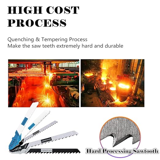 - HIGH QUALITY -- GINEPAN jig saw blades are made of high-quality materials such as high carbon steel and high-speed steel, and are produced by high-cost processes such as quenching and tempering. It is an ideal combination for general woodworking and thick metal or thin metal (ferrous and non-ferrous metals). Provides an efficient cutting experience.