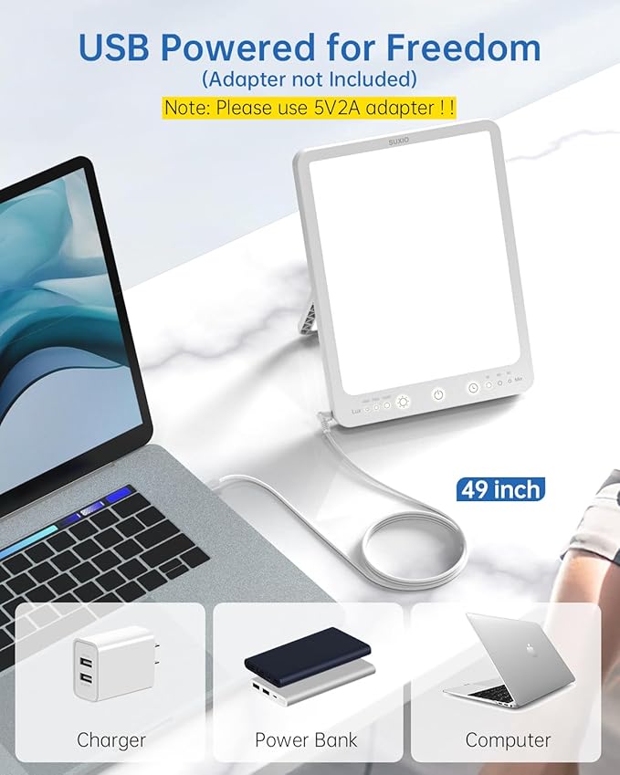 - 【Portable Light Therapy Box】 - This ultra-slim design artificial sunlight lamp comes with 49 inches USB cable (Adapter not Included), and comes with a standing stand to adjust the angle as needed to keep it in the best position, Freedom USB powered makes sun lamp light therapy lamp portable enough for working at home, in the office or on the go.