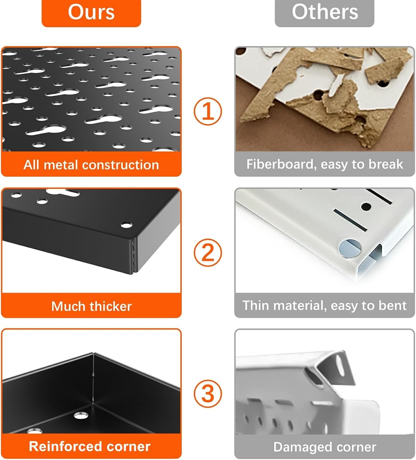 - Built to Last: Pegboard panels are made of high quality steel with powder coated finish, sturdy, scratch resistant and easy to clean. Will last forever, never warp and deteriorate. The metal pegboard will hold the weight of all your tools