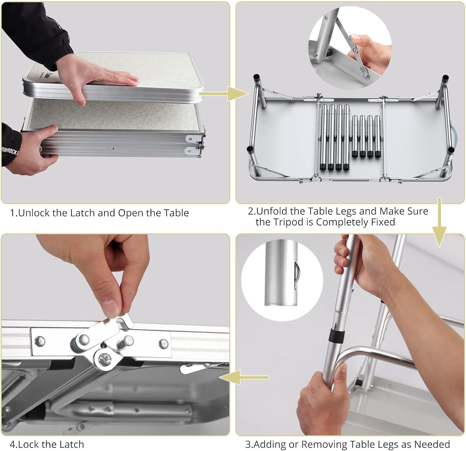 - Note: 1. Gently press the table top in the middle to make sure it is flat. 2. The dimensions of our camping tables are all measured by hand, so please allow an error of about 1 cm. Thank you for your understanding. 3. This product adjusts the height by inserting and pulling out the leg, please use it in a flat place