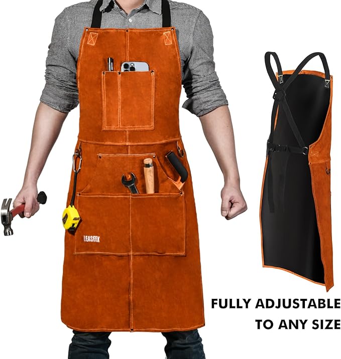 LeaSeek Leather Welding Apron - Flame and Heat Resistant Bib Apron with 6 Pockets