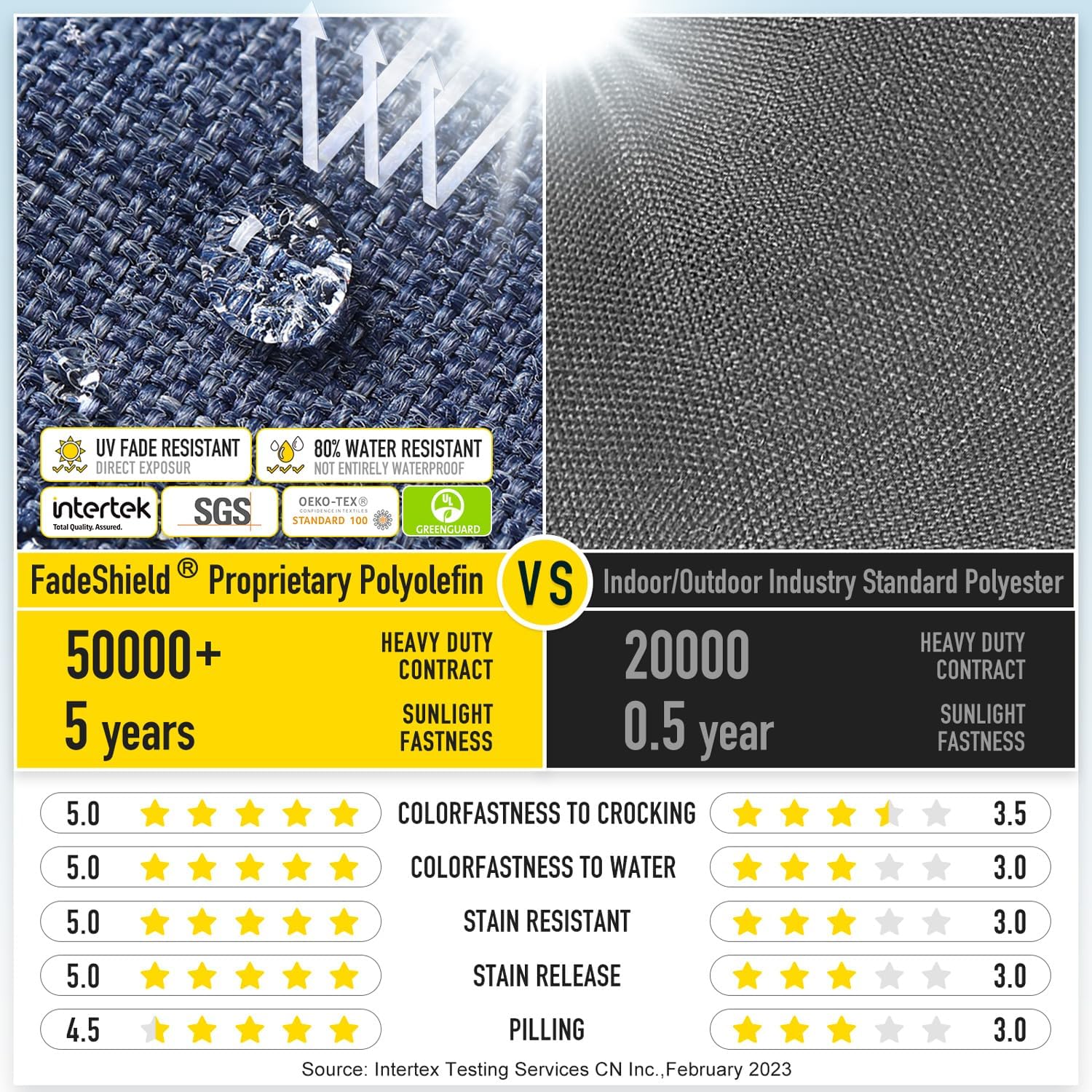 - 【FadeShield - UV Fade Resistant】FadeShield Proprietary Polyolefin are dependable indoor/outdoor performance fabrics, they are infused with antimiсrоbial silver Ion technology and can withstand 5 years of UV fade resistance, solution-dyed to make sure that each color is deeply ingrained in every fiber for continued vibrancy, even after heavy use. We recommend bringing it indoors when it rains or when not in use to preserve its lifespan and keep it looking beautiful.