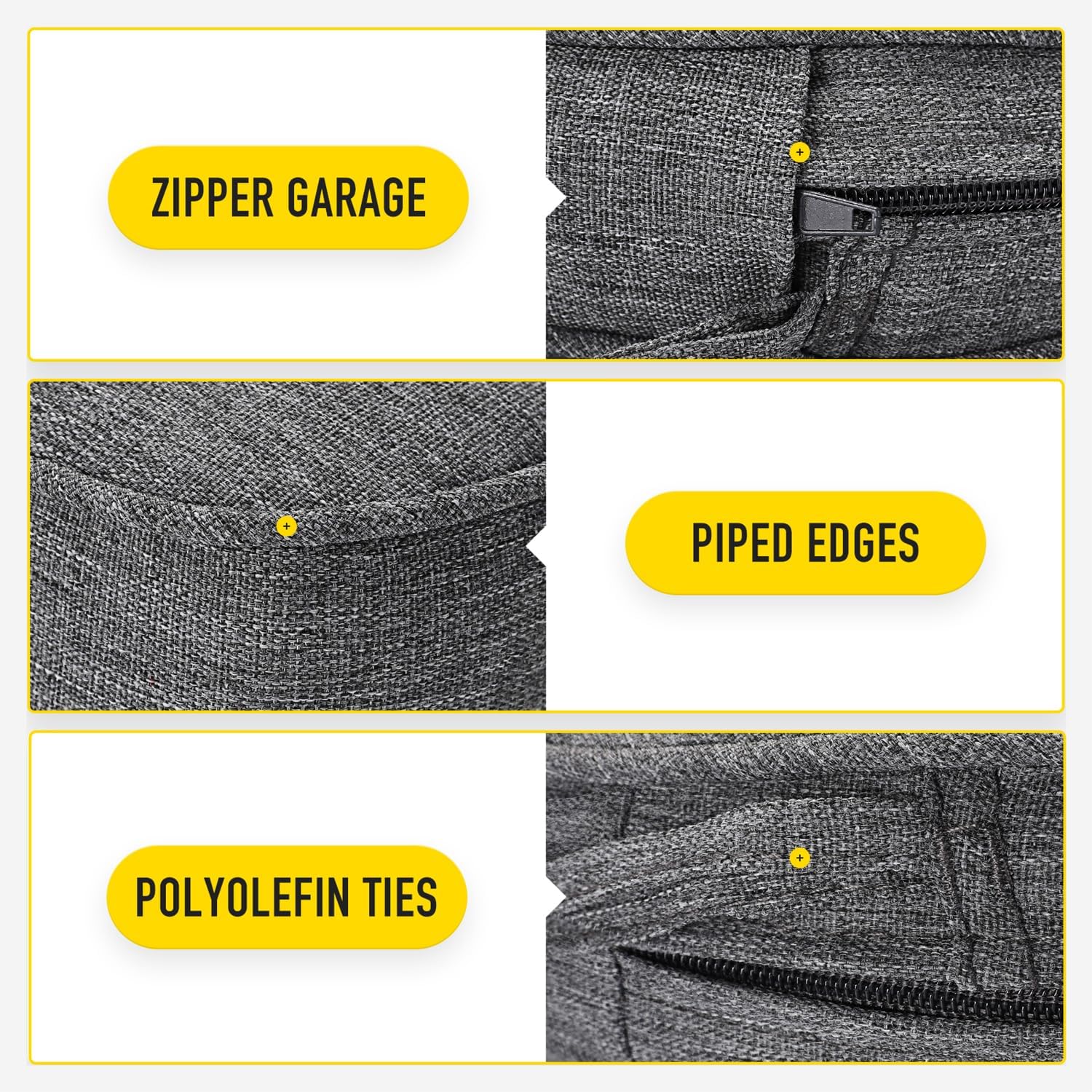 - 【Invisible Zipper Garage | Removable Cover with Ties】Zippers lock to keep a tight closure, stored in protective garages to prevent scratching your patio furniture when closed and offer a seamless look. Removable cover with non slip ties, customizable fit to keep your cushion where you want it.