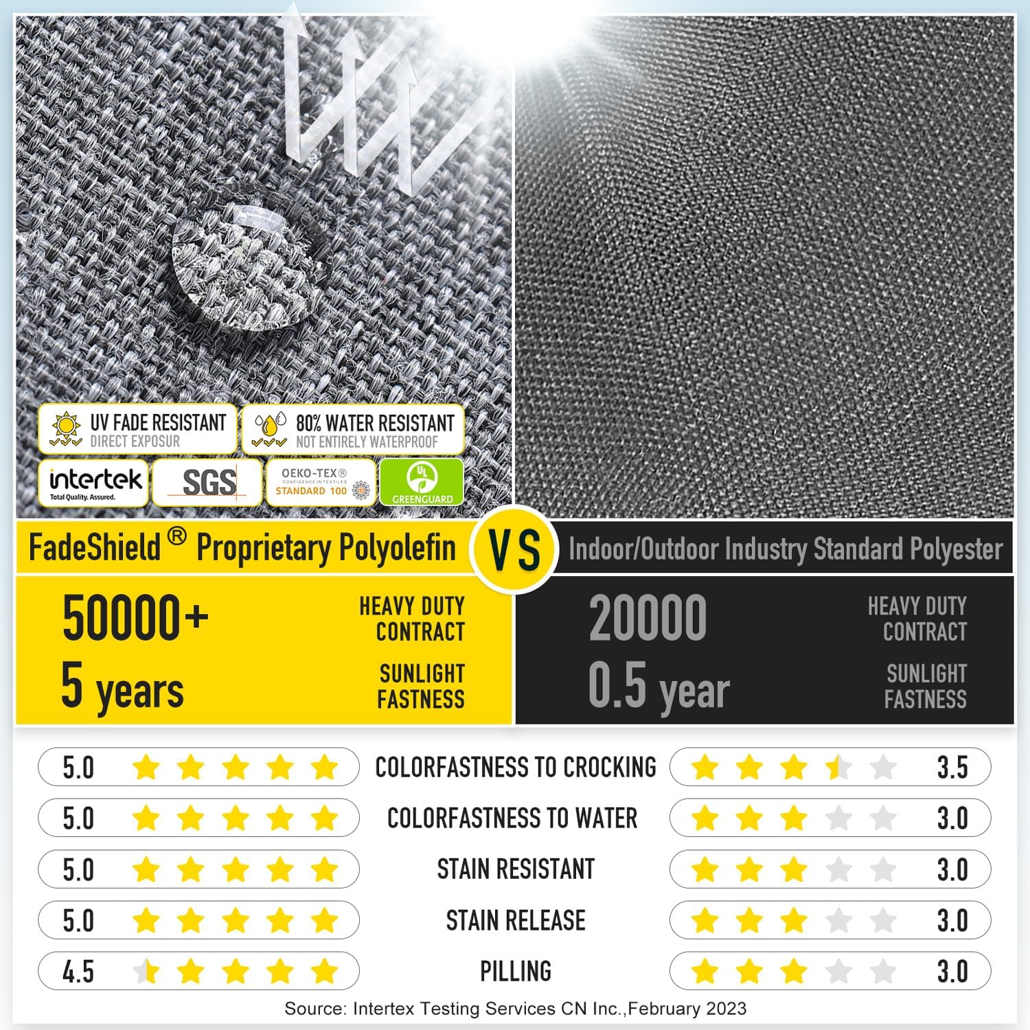 - 【FadeShield - UV Fade Resistant】FadeShield Proprietary Polyolefin are dependable indoor/outdoor performance fabrics, they can withstand 5 years of UV fade resistance, solution-dyed to make sure that each color is deeply ingrained in every fiber for continued vibrancy, even after heavy use. We recommend bringing it indoors when it rains or when not in use to preserve its lifespan and keep it looking beautiful.