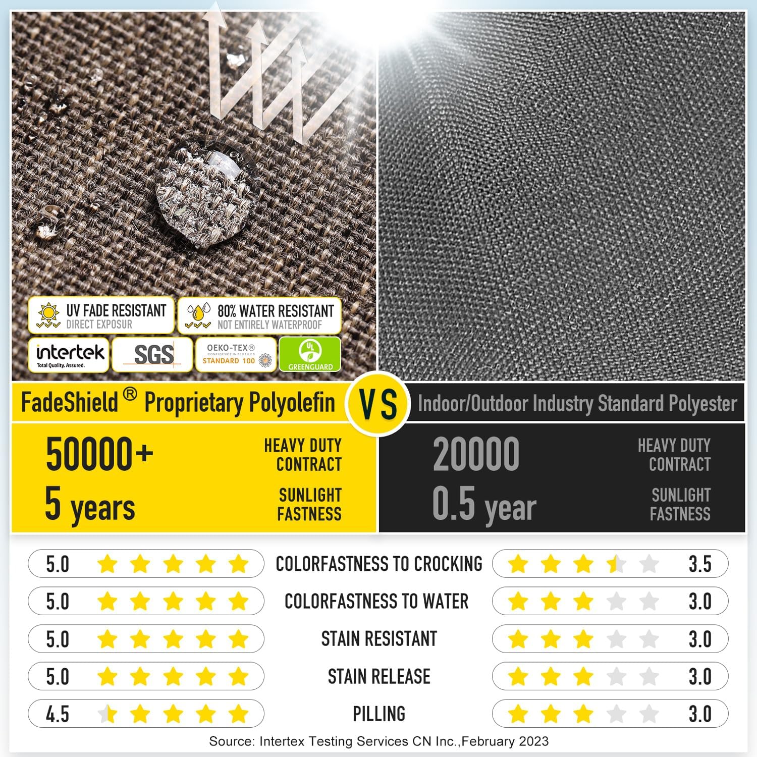 - 【FadeShield - UV Fade Resistant】FadeShield Proprietary Polyolefin are dependable indoor/outdoor performance fabrics, they are infused with antimiсrоbial silver Ion technology and can withstand 5 years of UV fade resistance, solution-dyed to make sure that each color is deeply ingrained in every fiber for continued vibrancy, even after heavy use. We recommend bringing it indoors when it rains or when not in use to preserve its lifespan and keep it looking beautiful.