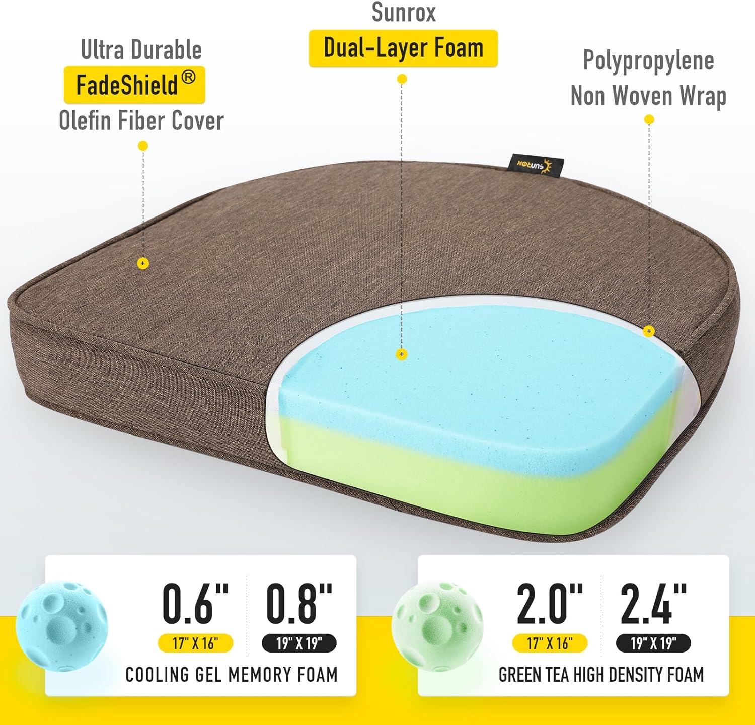 SUNROX Gel Memory Foam Chair Cushions, FadeShield Water-, Stain-Resistant Durable Reversible Seat Cushion Pads with Ties for Indoor/Outdoor Kitchen Dining Office, 19"x19", Set of 4, Heather Chestnut