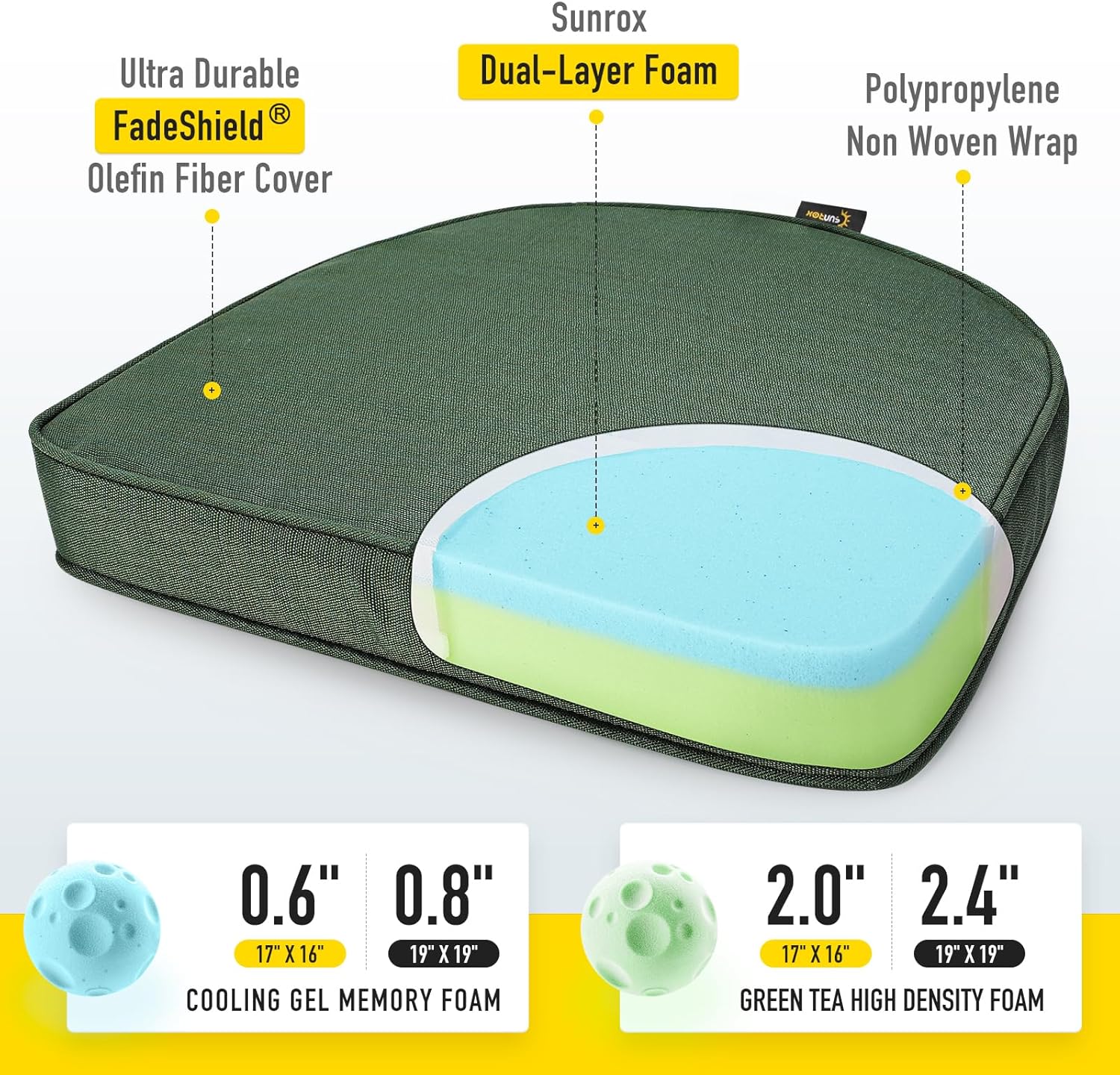 SUNROX Gel Memory Foam Chair Cushions, FadeShield Water-, Stain-Resistant Durable Reversible Seat Cushion Pads with Ties for Indoor/Outdoor Kitchen Dining Office, 19"x19", Set of 2, Heather Fern