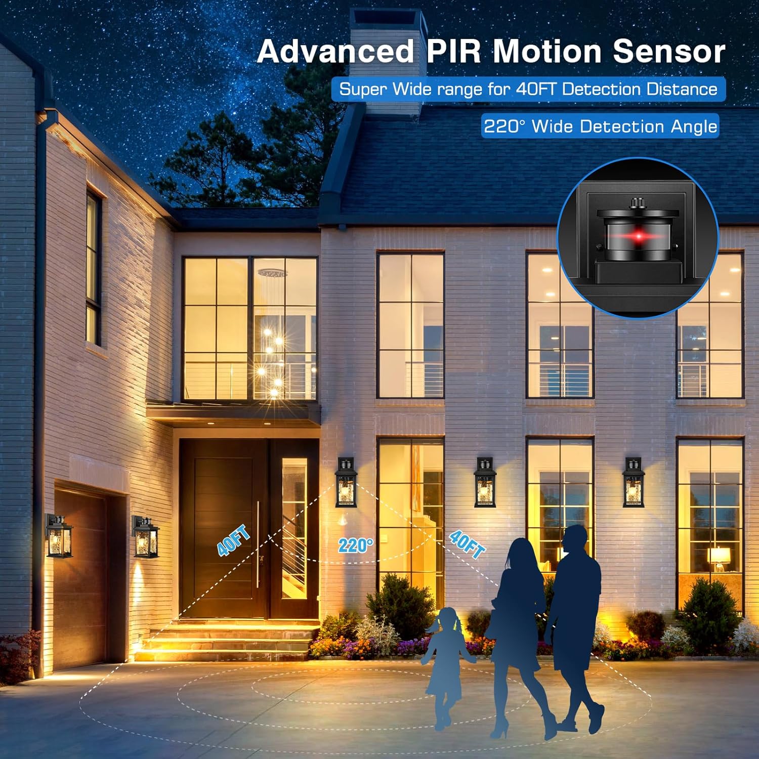 - 🌟【Innovative Motion Sensor Technology】Our exterior lights for house features a next-generation motion sensor with three different working modes. ①DIM MODE provides 30% brightness at night, and 100% brightness once motion is detected. ② ECO+ MODE: Full off at night, 100% light once motion is detected. ③OVERRIDE MODE keeps the lights on at 100% brightness all night. The outdoor lighting features dawn-to-dusk automation and turns off automatically after Dawn in any mode.