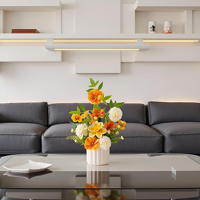 - Artificial Flowers in Vase: Flower arrangement with vase include white Chrysanthemum Ball Flowers, Orange Flowers,fake plants in a white ceramic vase.Fake flowers with vase suitable for table centerpieces for dining room, coffee table decor, table decorations for living room.
