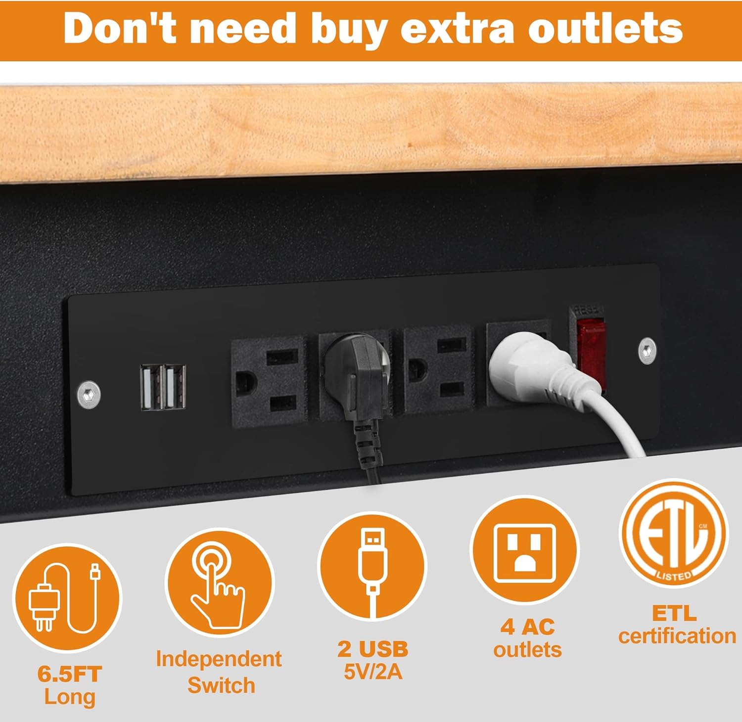 - 【4 AC 2 USB Power Outlets】 The ETL certified power strip has 4 AC Outlets, 2 USB Ports and 1 Switch, with 6.5 ft long Wire, which is safe and durable, making it easy to equip the worktable with various electric tools and lights
