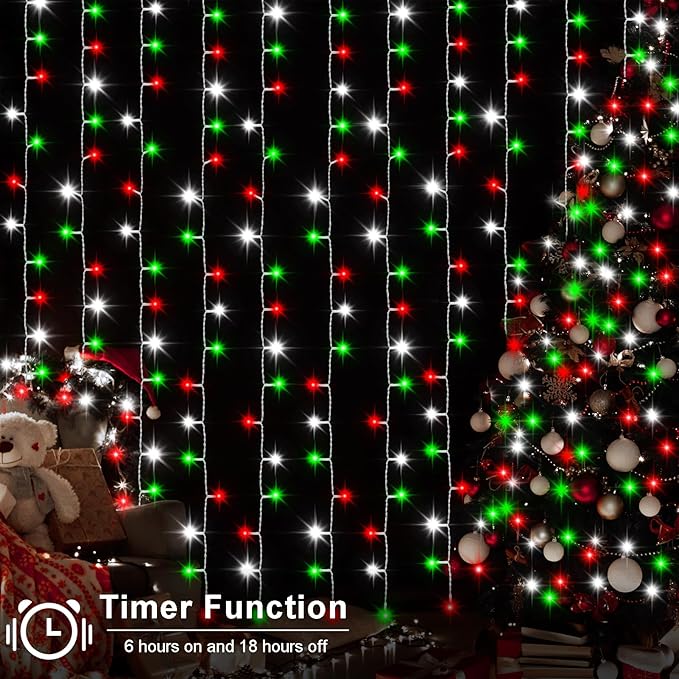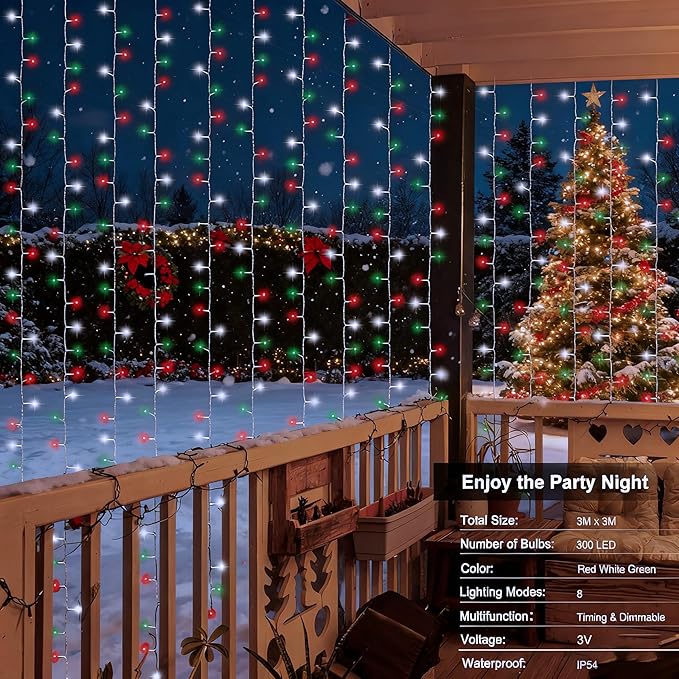 - Christmas Window Curtain Lights: Add a wonderful Christmas wall backdrop as you decorate for your event with this 9.8ft.x9.8ft 300 LEDs red white green curtains lights and extra 1.6ft long lead wire. The wire drop strings is tough & flexible, hanging & adjustable desired height naturally easily. No limits to your imagination