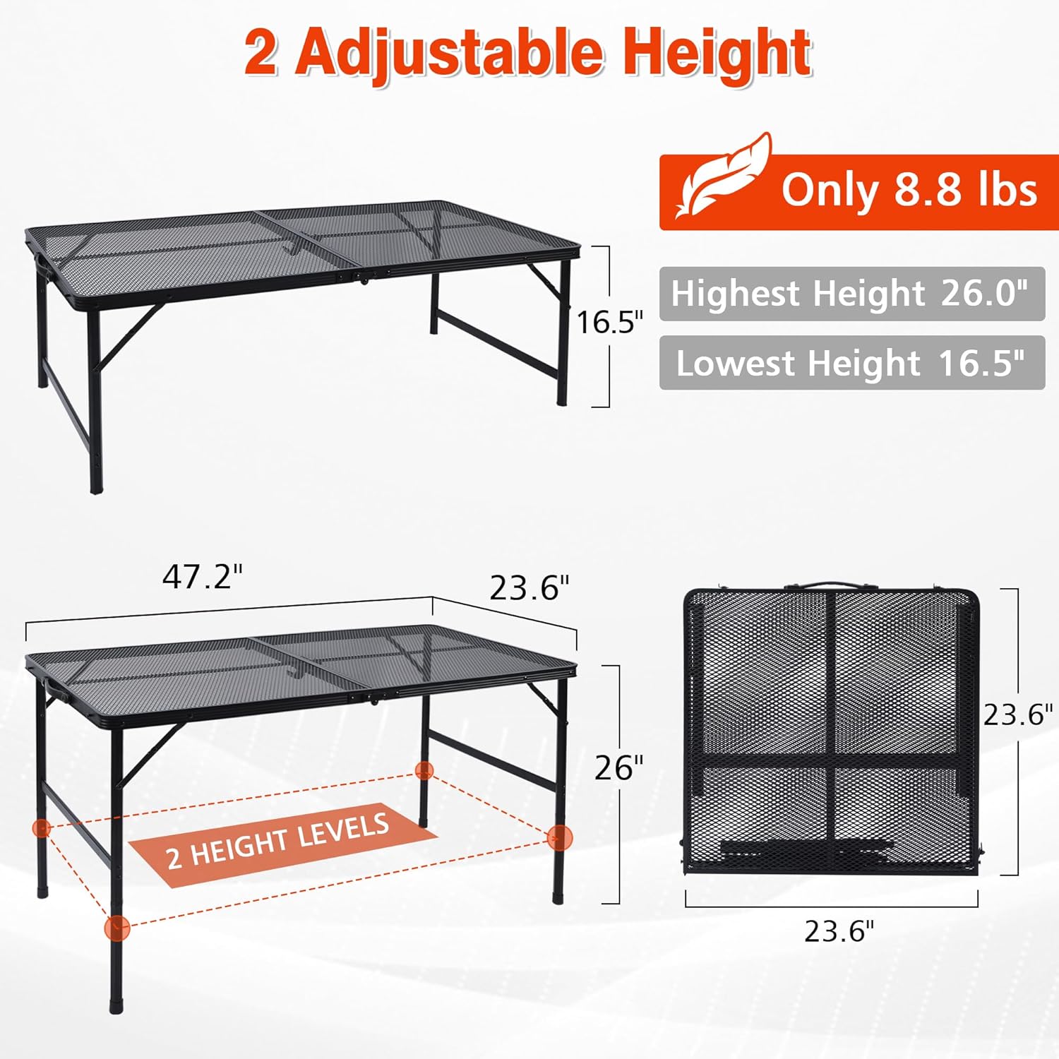 - 2 Adjustable Height: From the initial height of 16.5 inches, to just connect the tube feet can immediately have a height of 26 inches, JOUYEK folding grill tables provide the comfort for both standing and sitting.