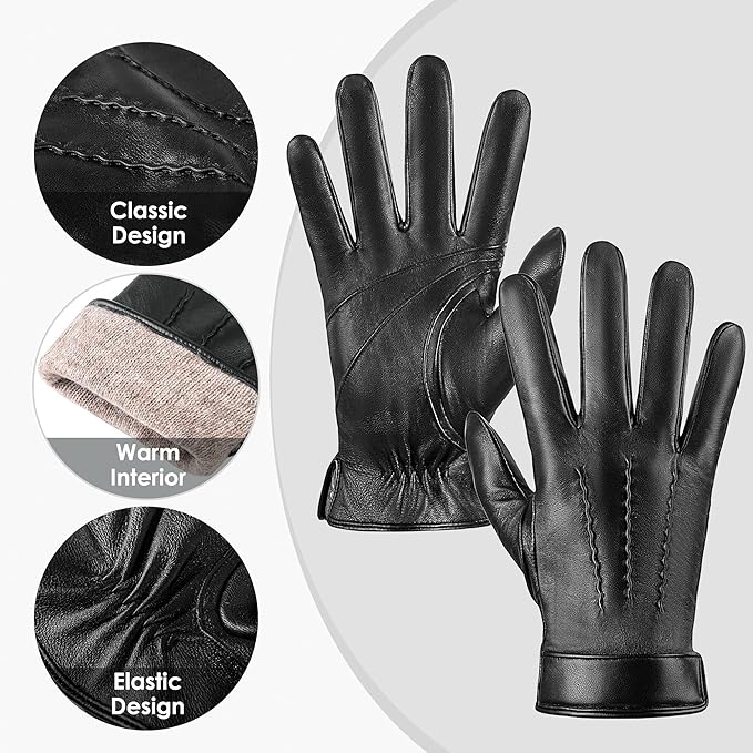 - Genuine leather gloves: Outer is made of premium top layer genuine sheepskin leather with softness of touch, suppleness, strength and lasting comfort. Fully lined with Italian cashmere let the gloves be your chic cold weather essentials.