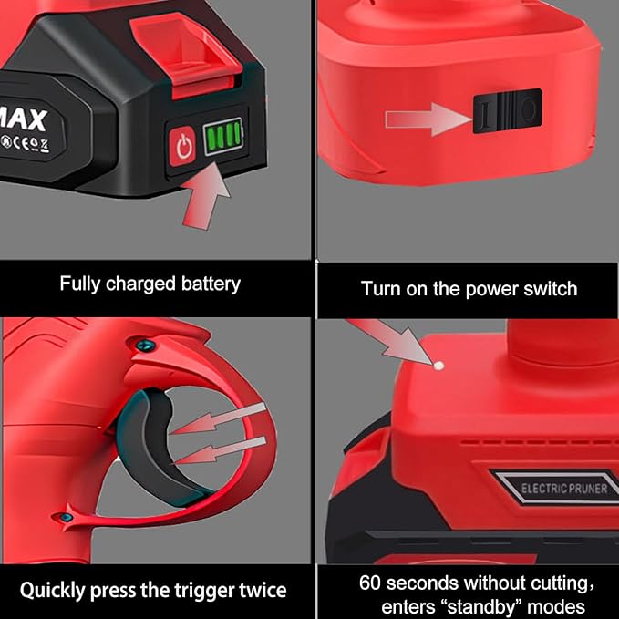 - Dual Safety Lock System: To prevent accidental activation of battery operated pruning shears, Press the trigger twice rapidly to activate, ensuring no unintended starts, Auto Sleep Mode, Powers off after 60 seconds of inactivity to save battery and prevent accidents, Your safety is our priority!