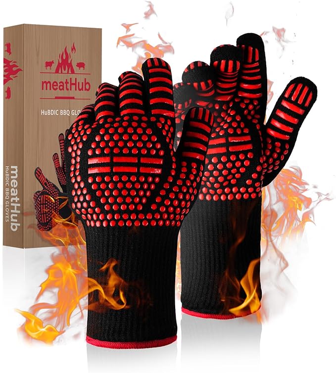 - ✅【Universal & Versatile】- The high-temperature BBQ gloves are made for multi-purpose use and are perfect for all BBQ grilling, baking, cooking, and camping occasions, or anything involving heat. They will make a great gift for any birthday, Father’s Day, Thanksgiving Day, Christmas, or any other occasion. Enjoy your safe BBQ party with MeatHub gloves!