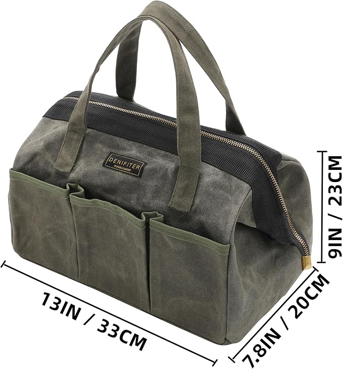 13-inch Tool Bag, Heavy Duty Wide Mouth Water-Resistant Tool Bag, Tool Tote with Handle for Tools, Wrenches, Screwdrivers (13 X 7.8 X 9 inch) | ArmyGreen