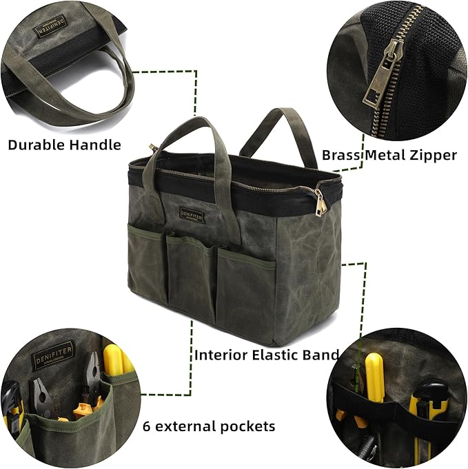 - PRODUCT DESIGN: This tool bag has 6 external pockets and 4 inner pockets, a large main compartment with internal steel reinforcement for maximizing the space on the top. It can help you organize your tools and easily identify them, saving space and time.