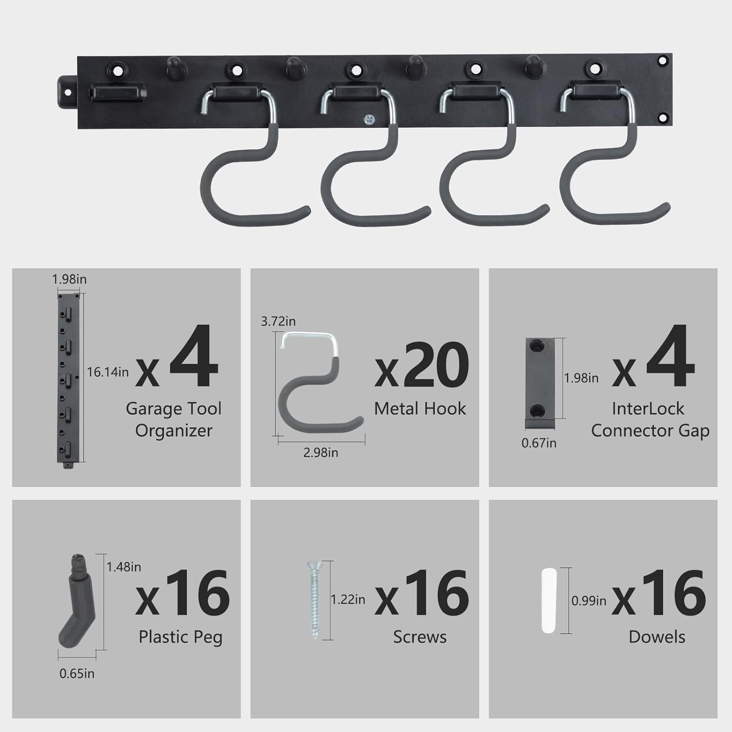 - Adjustable Hooks: The garden tool organizer for garage includes 20pcs adjustable s hooks and 16pcs peg hooks. Each hook is removable, you can customize the spacing between the attachments on the 64" steel rail (4 panels) to meet your needs. Each hook of tool organizer bears the weight up to 12LBS(5.44KG), each peg can bear the weight 5LBS(2.26KG).
