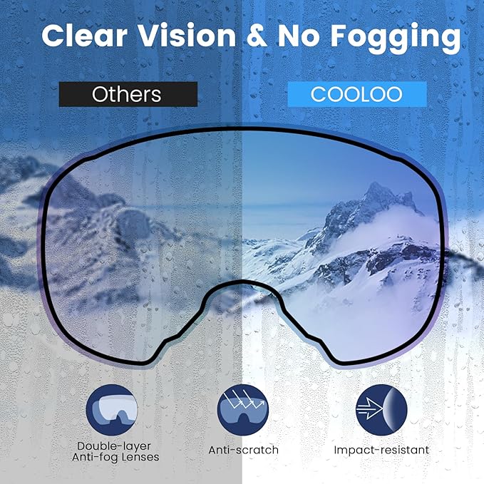 - CLEAR VISIBILITY: The COOLOO adult ski goggles feature an anti-scratch, impact-resistant, and anti-fog double lens, with the inner lens providing long-lasting anti-fog performance. Say goodbye to fogged up ski goggles while skiing or snowboarding, and enjoy a 180° clear wide vision for maximum safety on the slopes.