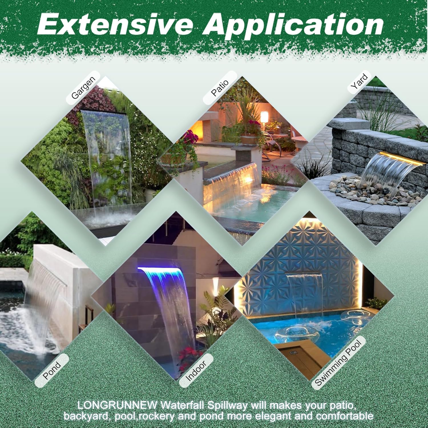 - ăGarden & Pond Decoration Waterfallă- The LONGRUNNEW waterfall spillway lends decorative elegance and beauty to gardens and pools. With optional color-changing LED light strips sold separately, it creates a special ambience at night. The gentle sound of the cascading water enhances outdoor patios. Note that LED light strips are not included with the waterfall, but are available for separate purchase in our store.