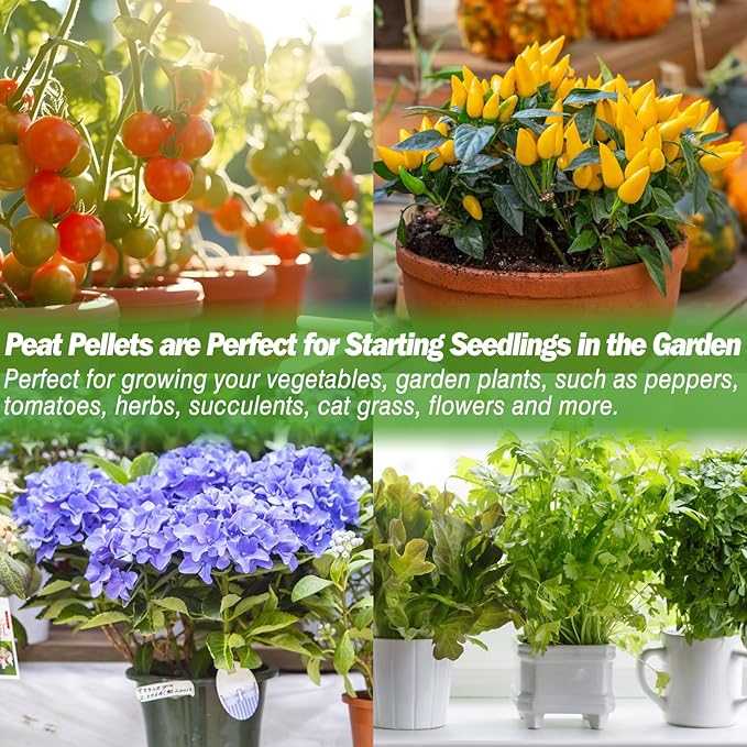 - 【Wide Application】 Seed starter peat pellets are perfect for vegetable gardening and horticultural plants such as peppers, tomatoes, cucumbers, succulents, herbs, flowers and more. They are easy to cultivate and has a high success rate. You can also plant them with your family or friends to enjoy the fun of planting together.