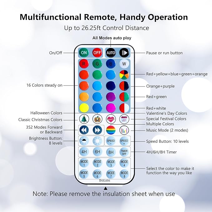 - Different Timer Options & Memory Function: Color changing string lights have a memory function, no need to repeat settings. Set "4H" "6H"& “8H” by remote, the Christmas fairy lights will be automatically on for 4/6/8 hours and off for 20/18/16 hours per day. Press the "Time OFF", and the timer will be canceled. Note】While the timer is activated, the blue indicator light inside the adapter will be on; while the timer is canceled, the blue indicator light is off.