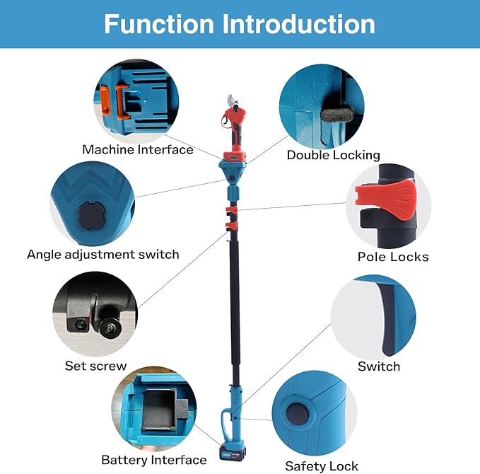 - Lightweight Design & Dual-Safety Protection: This electric pruners cordless weighing just 6.4 lbs including(battery+pole),features an ergonomic grip for fatigue-free overhead pruning,electric pruning shears cordless Dual safety system - Requires two button presses to operate,while auto idle lockout engages after 60 seconds.