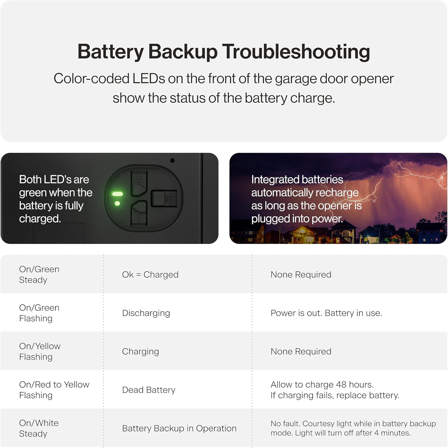 - BATTERY BACKUP INCLUDED: An integrated battery backup allows for this Genie garage door opener to be used when the primary power is out.