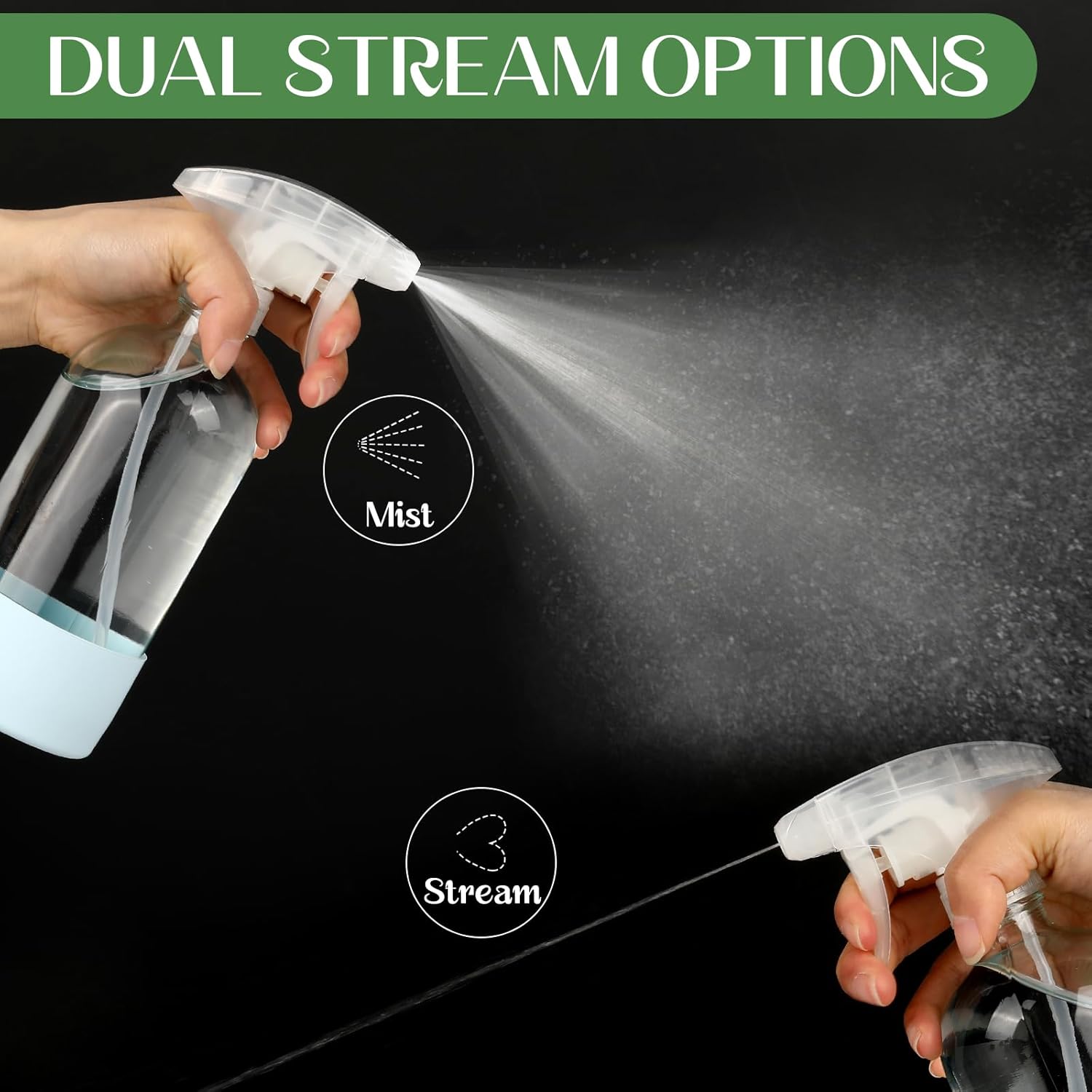 - Adjustable Dual Cap Nozzle: Upgraded nozzles x 12, tested to spray more than 100,000 times without crack, we are equipped with three settings: mist, stream, or off option, each spray bottle can pump liquid uniformly for the best coverage area and reach