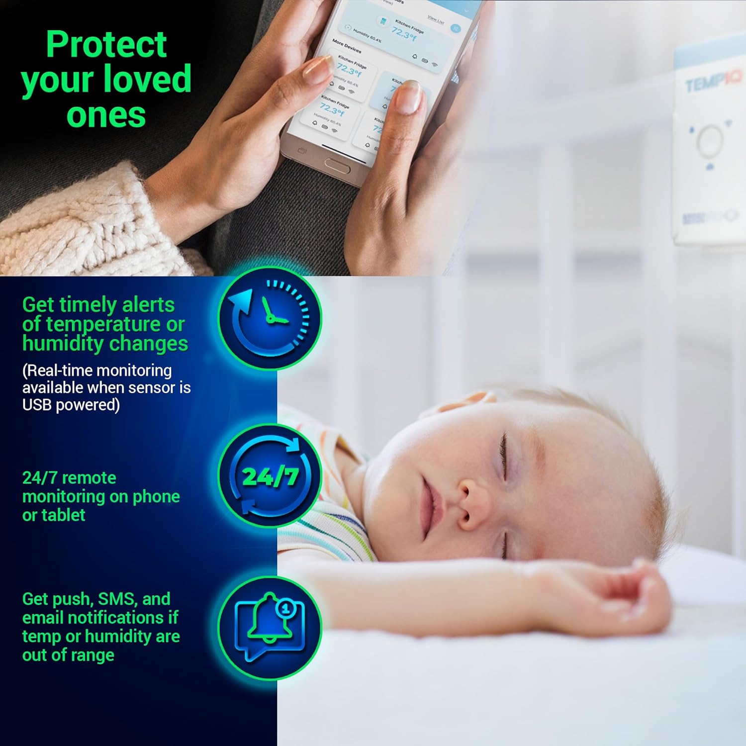 - GET TIMELY ALERTS: TEMPIQ sends real-time alerts (push, text, and email) for temperature and humidity changes only when powered via USB. In battery mode (3x 1.5V AA lithium batteries), the device enters power-saving mode and sends periodic readings every 15-60 mins. If immediate environmental alerts are important for you, we recommend powering the device with USB for full functionality.